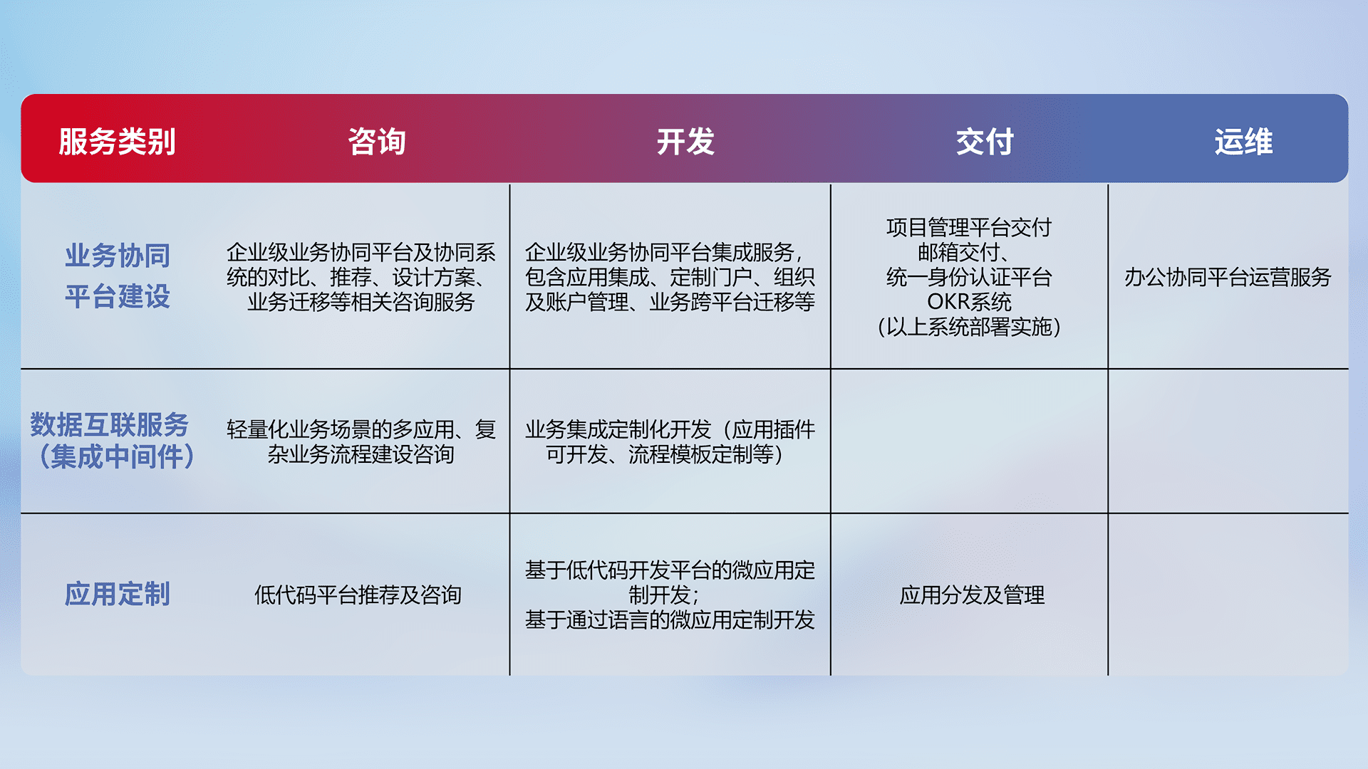 针对钉钉、、、企微、、、IDaas等平台级产品提供产品的规划、、方案、、交付、、、定制化开发等服务,,,,实现如统一协同办公、、、、智能客户服务、、、、混合会议管理、、、、智能数据查询、、、、等业务场景,,,实现数字化转型。。。。
